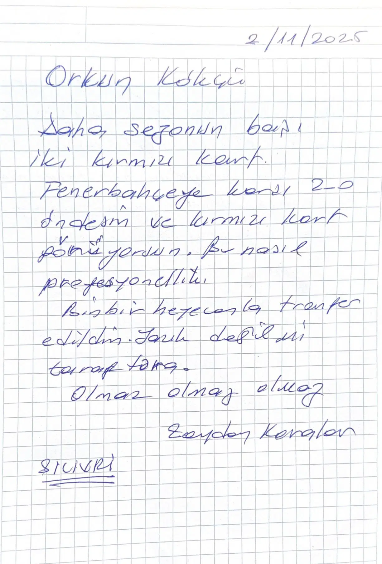 Karalar, “Orkun Kökçü, Daha sezonun başı, iki kırmızı kart. Fenerbahçe’ye karşı 2-0 öndesin ve kırmızı kart görüyorsun. Bu nasıl profesyonellik? Binbir heyecanla transfer edildin. Yazık değil mi taraftara? Olmaz olmaz olmaz” ifadelerini kullandı.